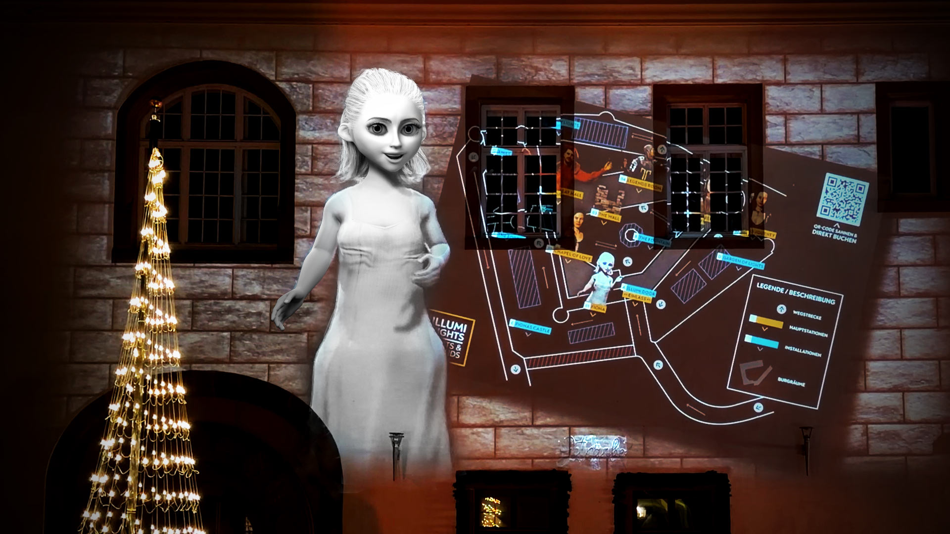 Ein wiederkehrender Bestandteil der ILLUMINIGHTS ist Fiona, das Schlossgespenst, die als charmante Gastgeberin durch die Erlebniswelt führt. Sie erscheint zwischen den Szenen, taucht in Projektionen auf und verbindet die einzelnen Stationen zu einer zusammenhängenden Legendenreise.